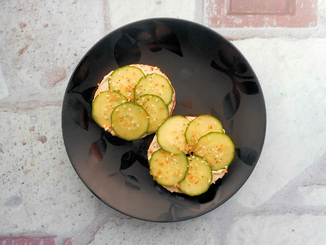 I think I may have found my new favorite vegan cream cheese--and it's so easy to make at home for so much cheaper than the prepared stuff! Plus it's got protein. Okay, hard sell, maybe, but really, this was delicious. The cheese recipe is at Okonomi Kitchen. I spread that thickly over a toasted bagel from my freezer, then topped it with sliced cucumber and some everything bagel seasoning. This is delicious.