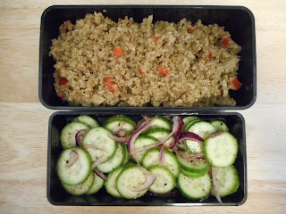 A quinoa mix with the last of a package of Morningstar Farms pork-style shreds and some added veggies and more of the riff on Scandinavian cucumber salad from Cookery for 1 or 2 that I had made in yesterday's post. (I liked it so much I made more in the morning.)